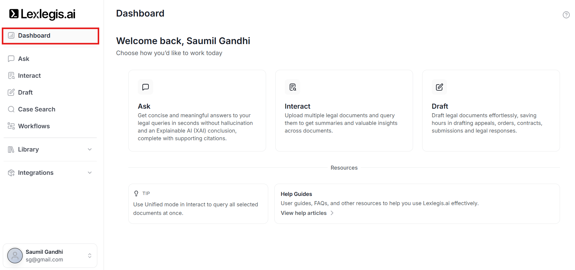 The dashboard is your primary navigation hub. It helps you decide which module you want to start your legal workflow with.
