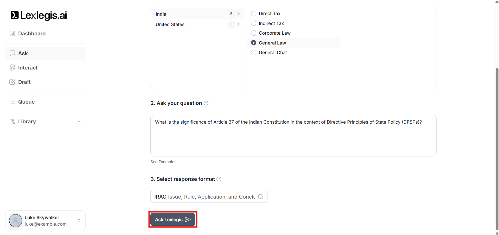 Select Ask Lexlegis to generate the response.