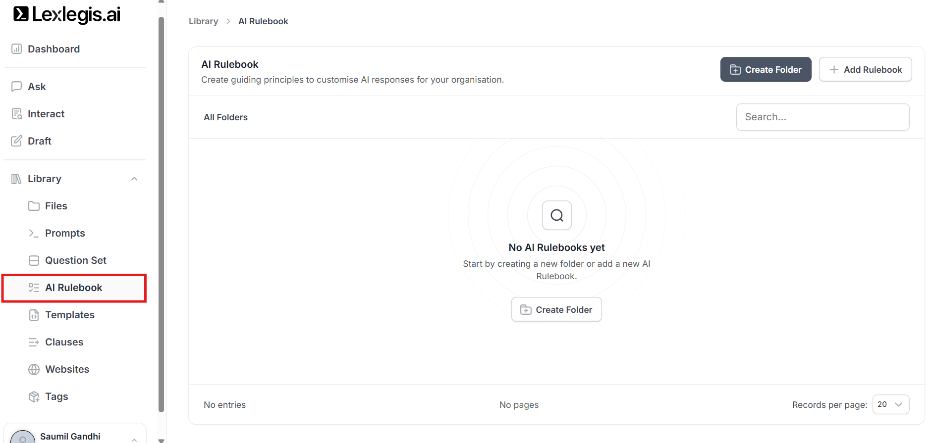 Rulebooks may be added to the Library from any workflow, but folders are created and managed exclusively within the Library.