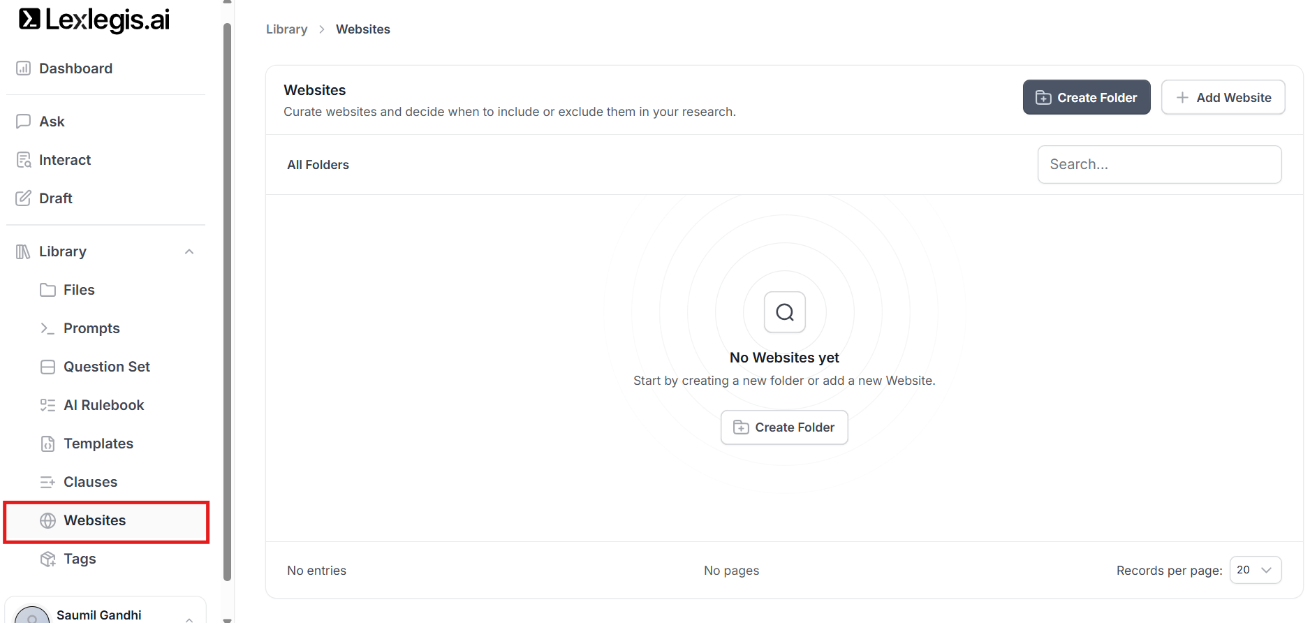 Websites may be added to the Library from any workflow, but folders are created and managed exclusively within the Library.