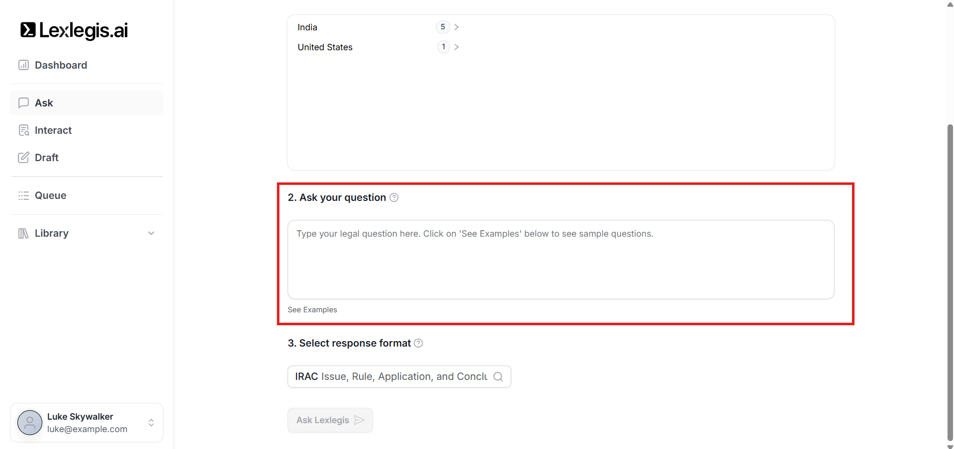 On the Ask page, use the Ask your question text box to enter your legal query.
