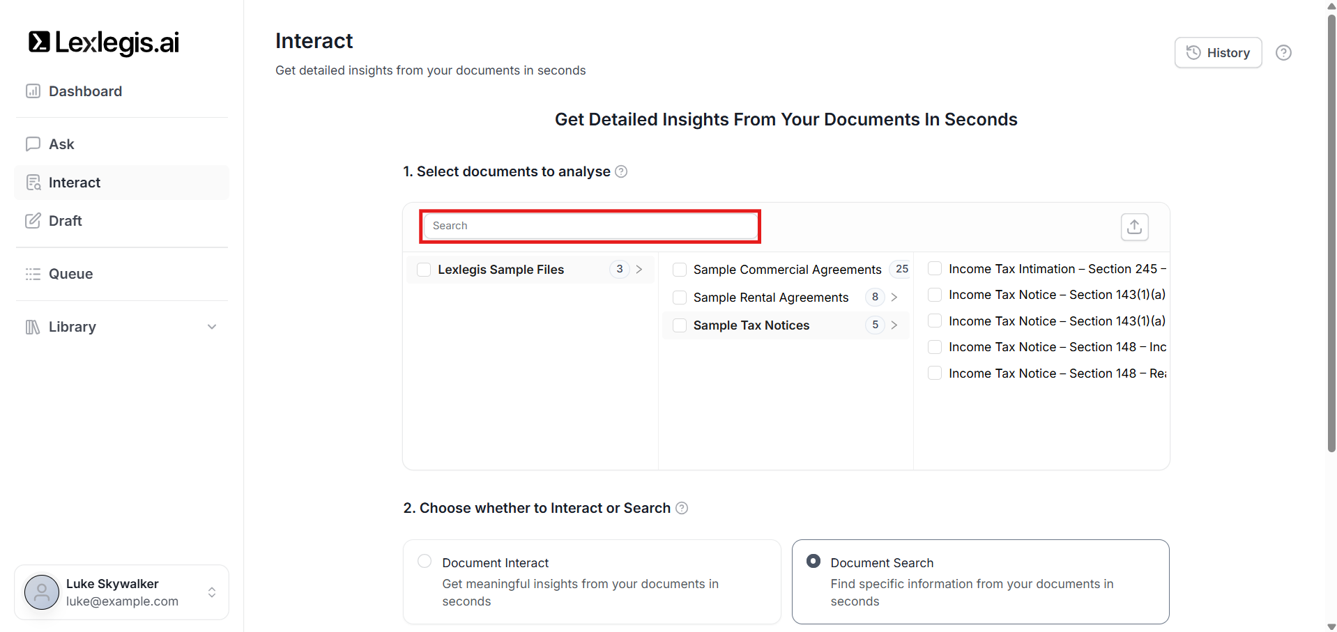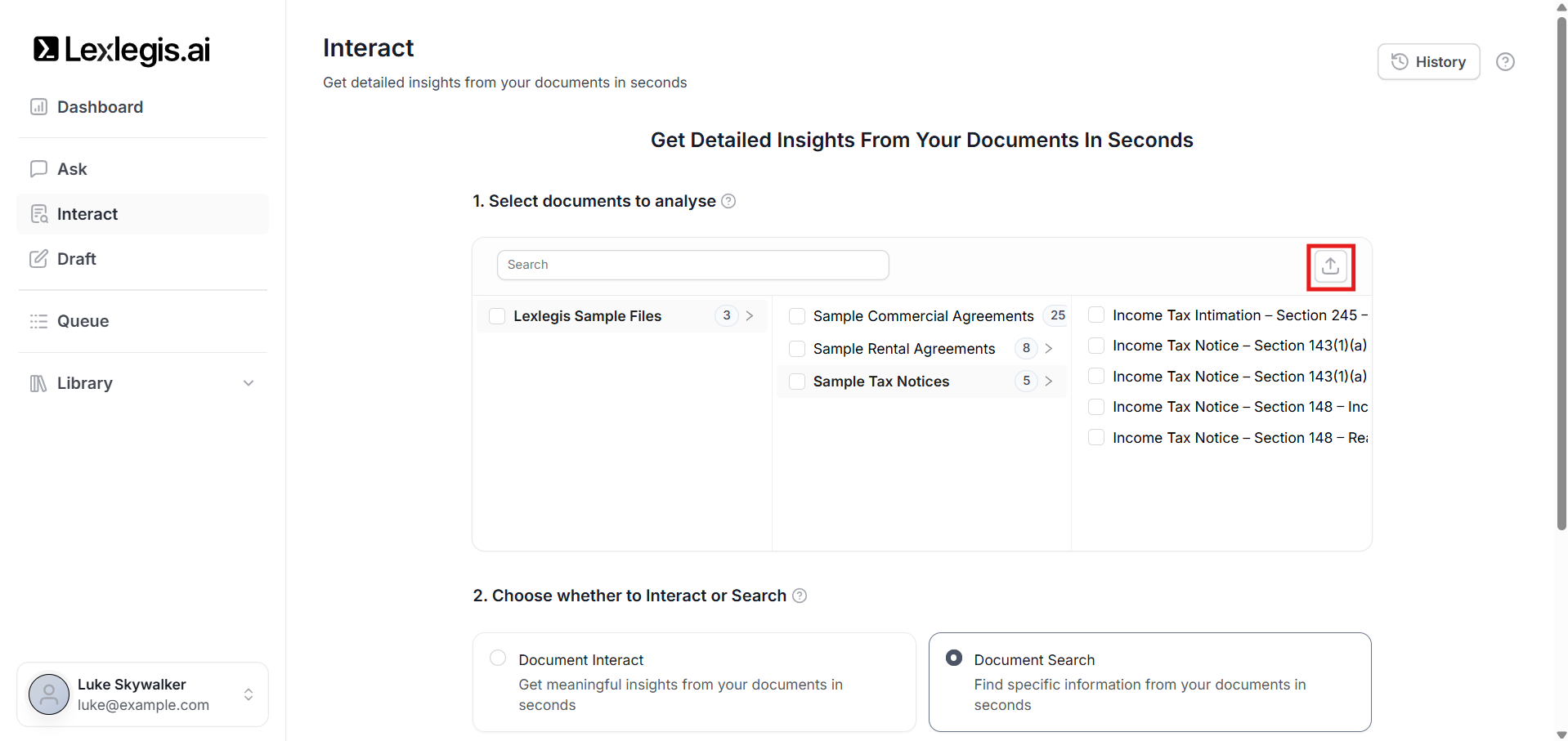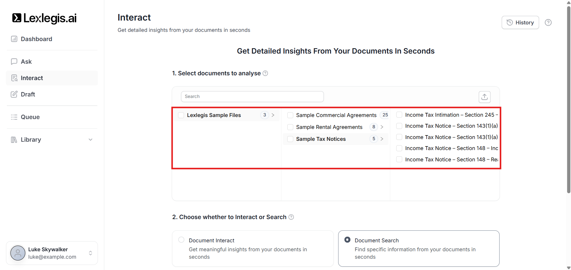 The Select documents to analyse step defines the scope of analysis for Interact. Lexlegis will generate insights only from the documents you select here.