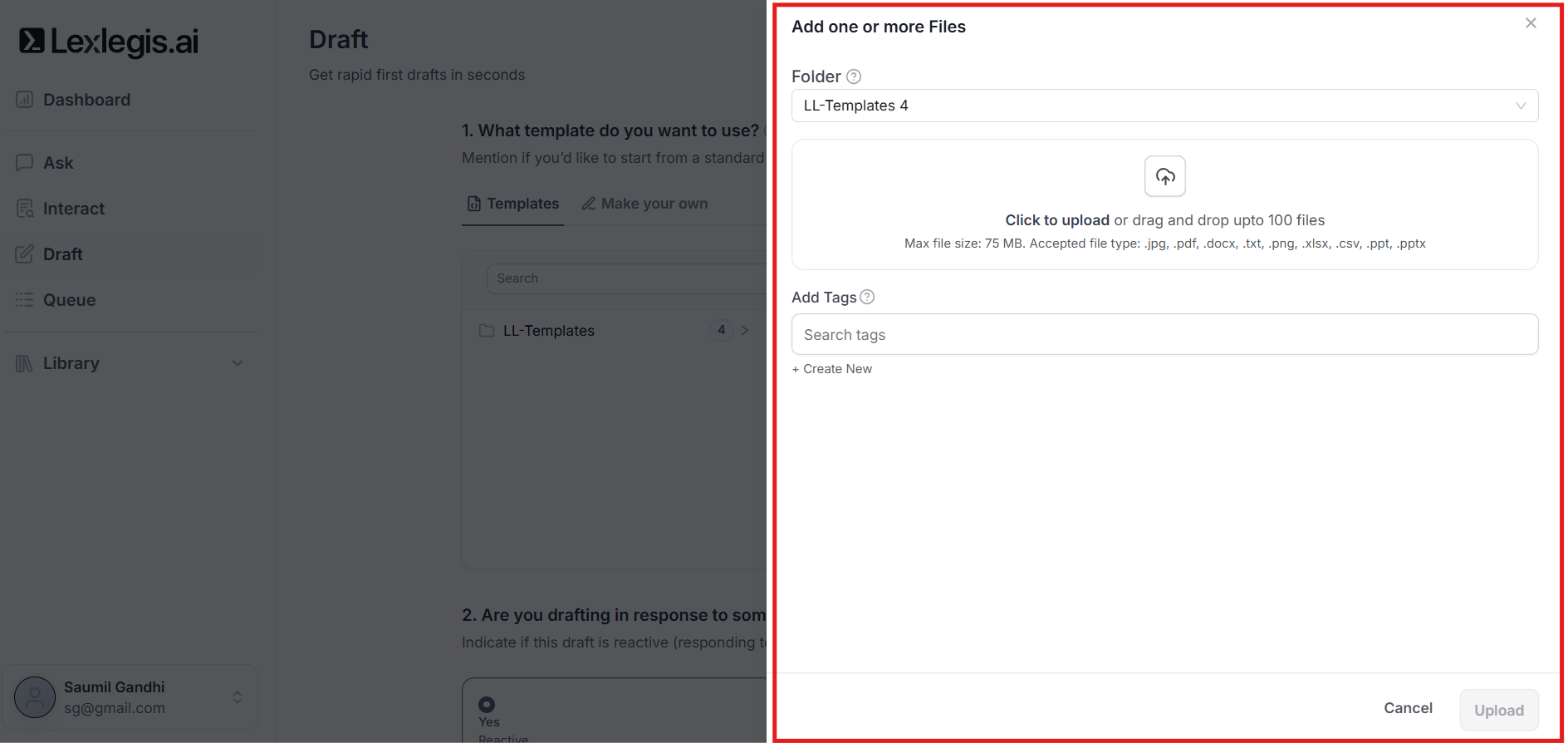 If the template you want to use is not already available, you can upload a template directly from the Draft workflow.