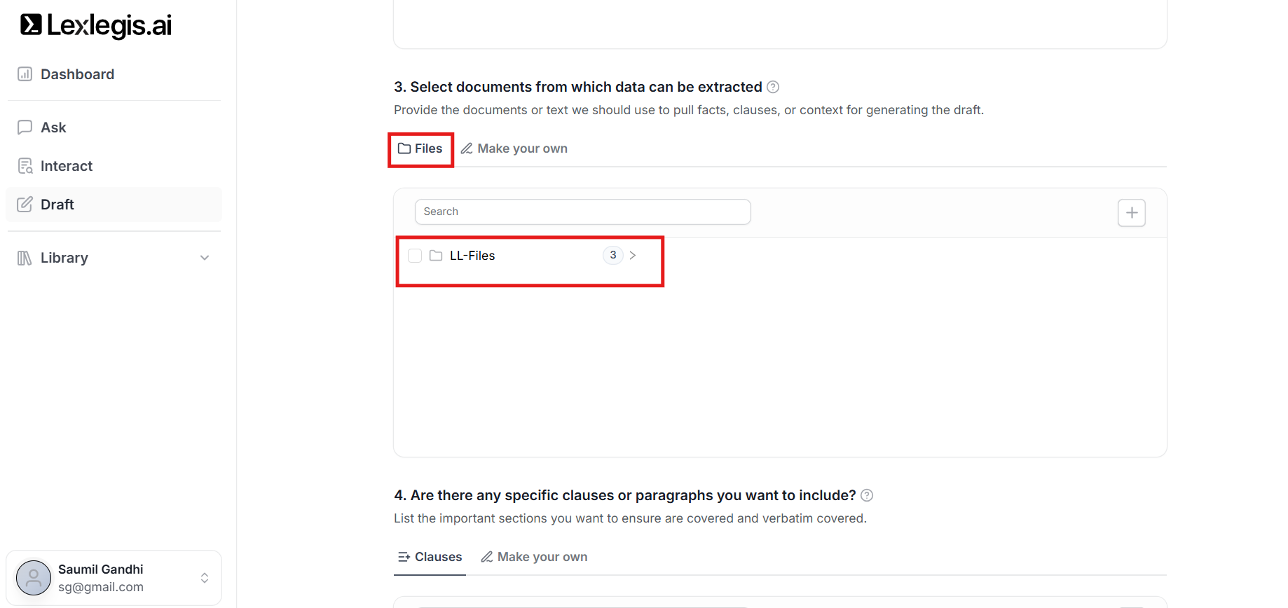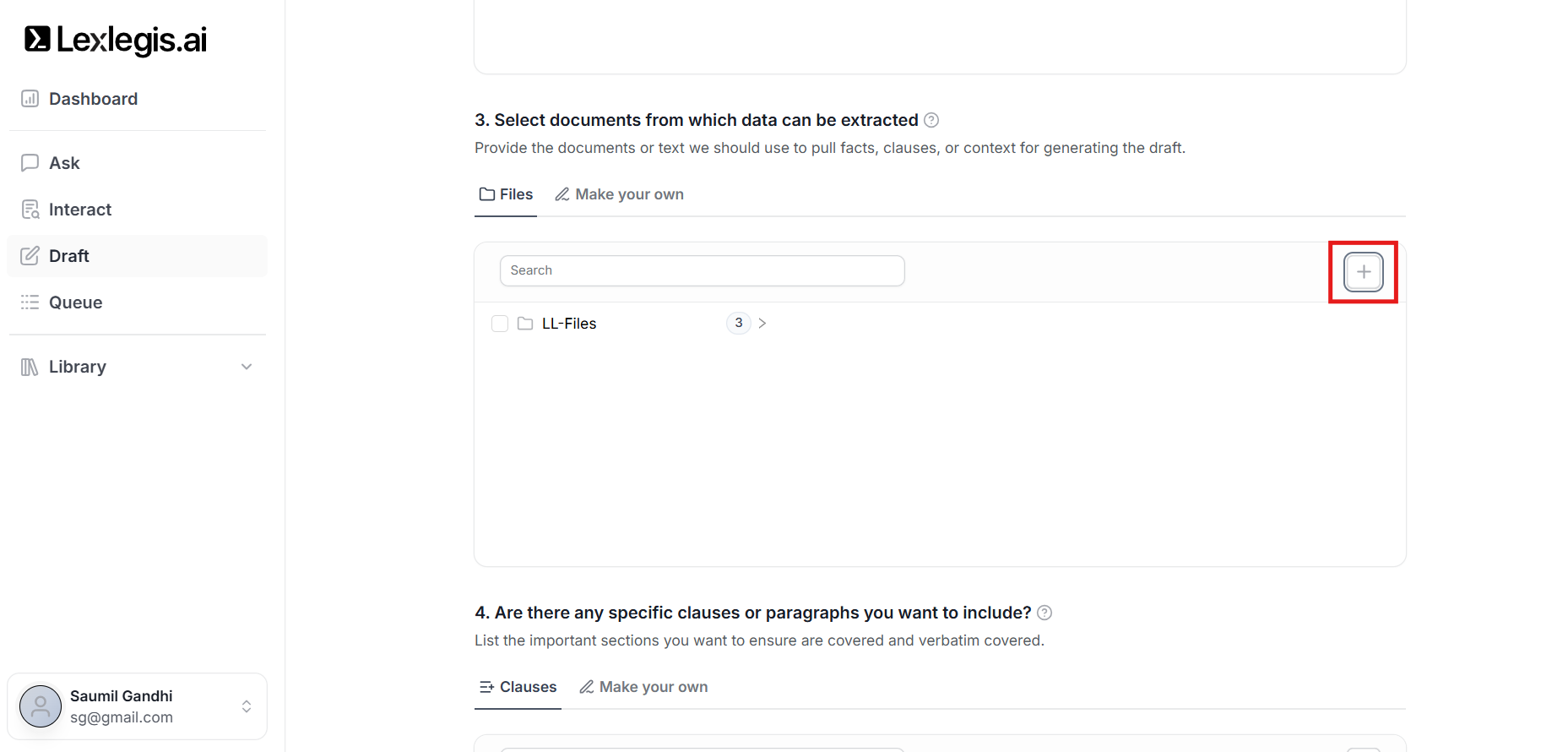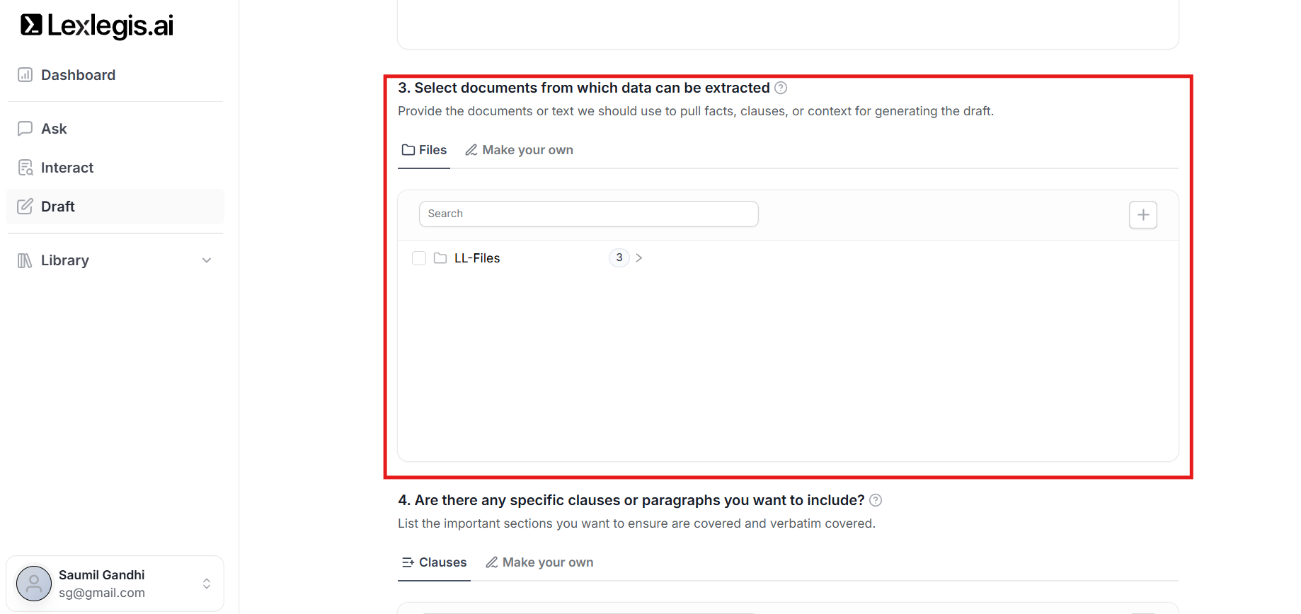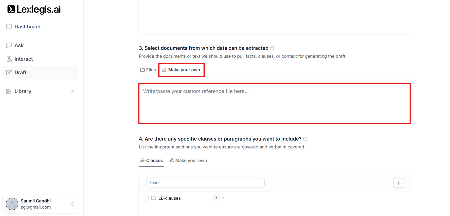 Once you move forward, Lexlegis uses the selected sources for drafting.