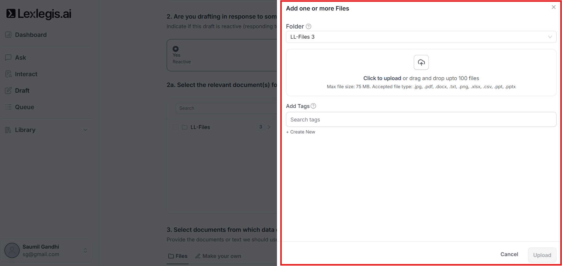 Choose Files to select documents that already exist in your Lexlegis Library.