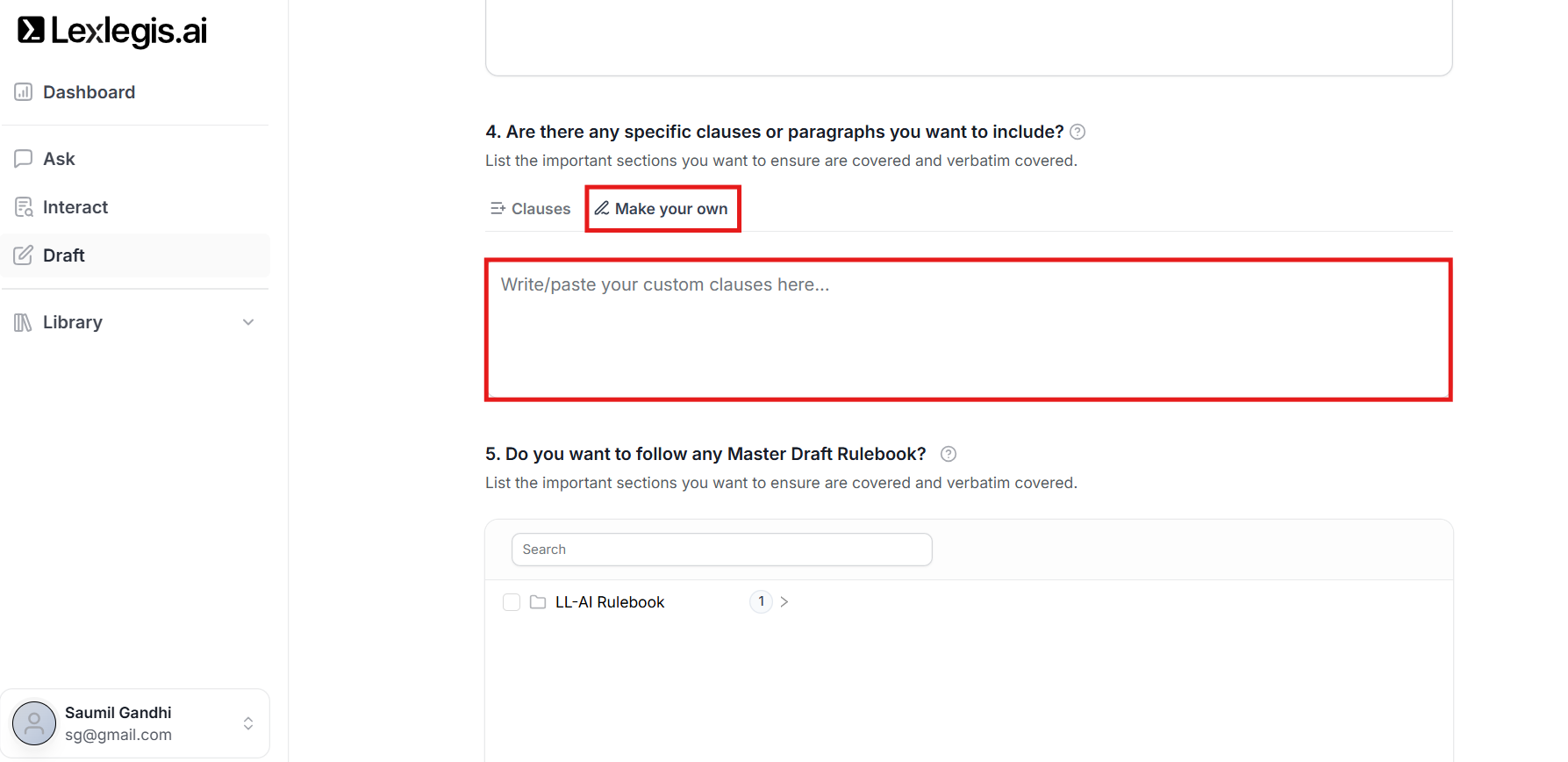 While drafting a document in Lexlegis, you can specify exact clauses or paragraphs that must be included in the final output. This ensures that critical provisions are covered accurately and, where required, verbatim.