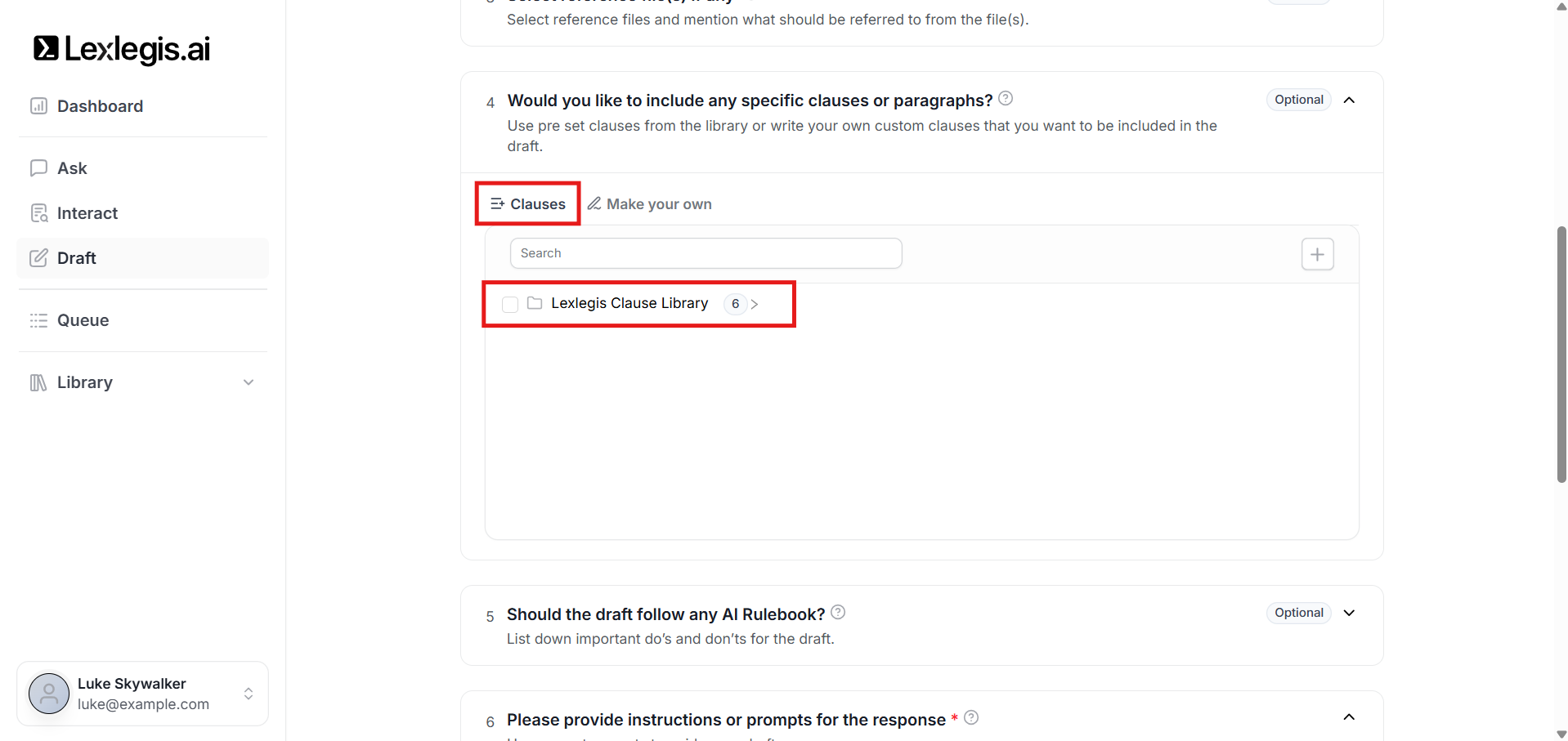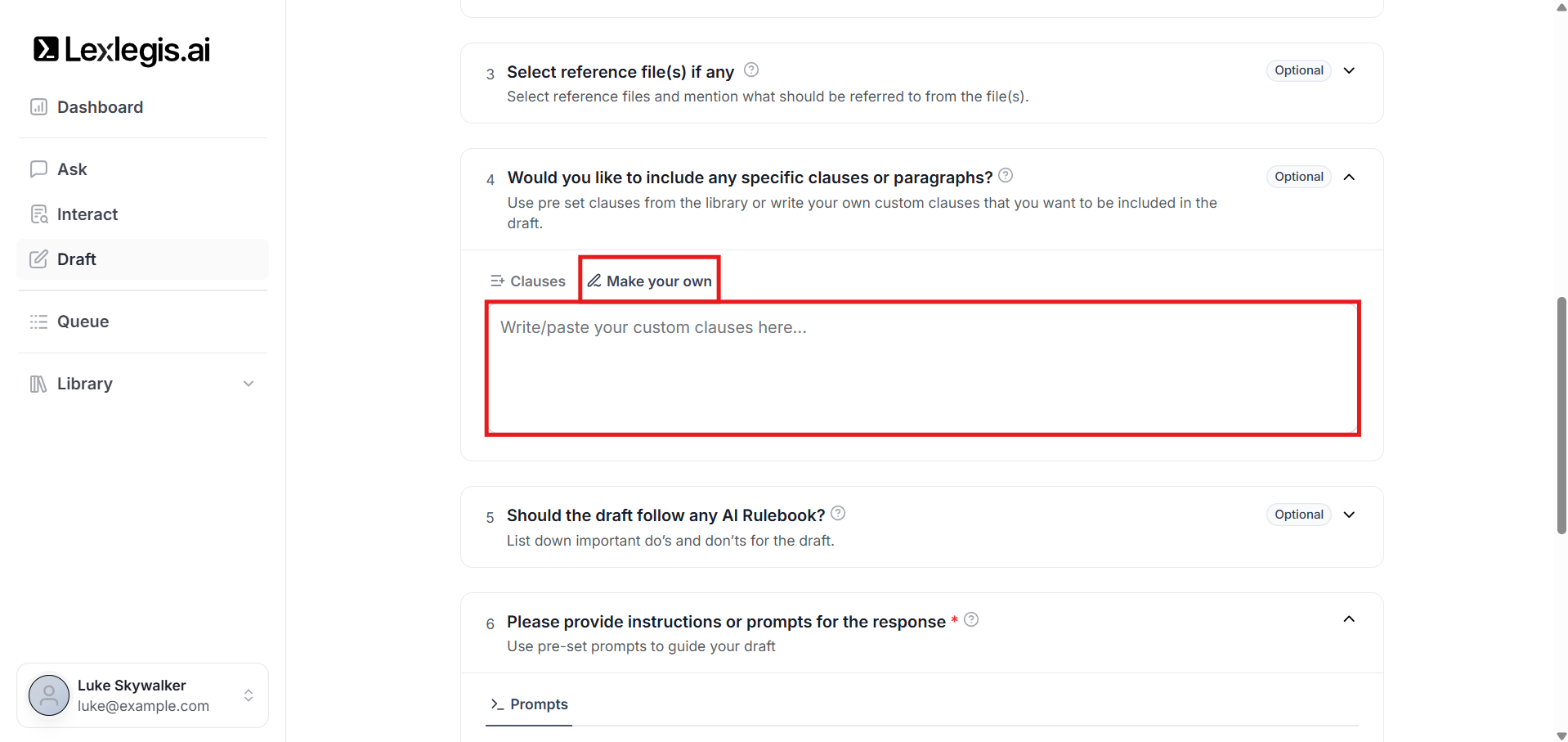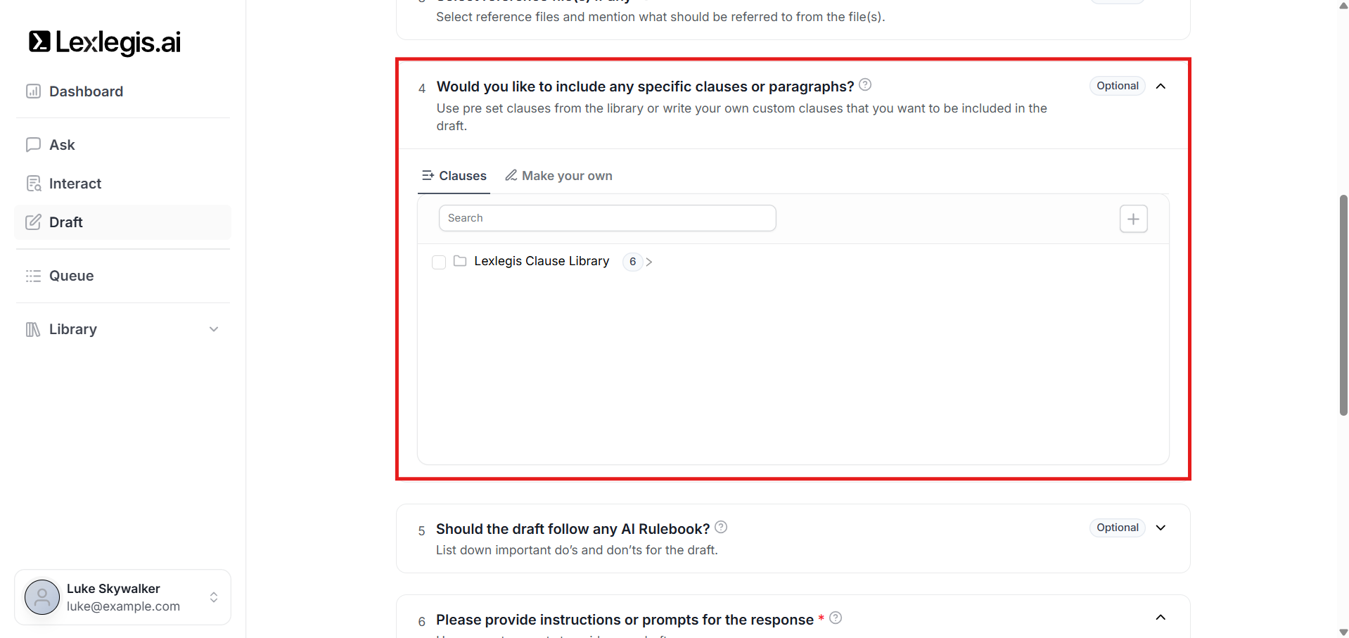 This step gives you greater control over the legal language used in the generated draft.
