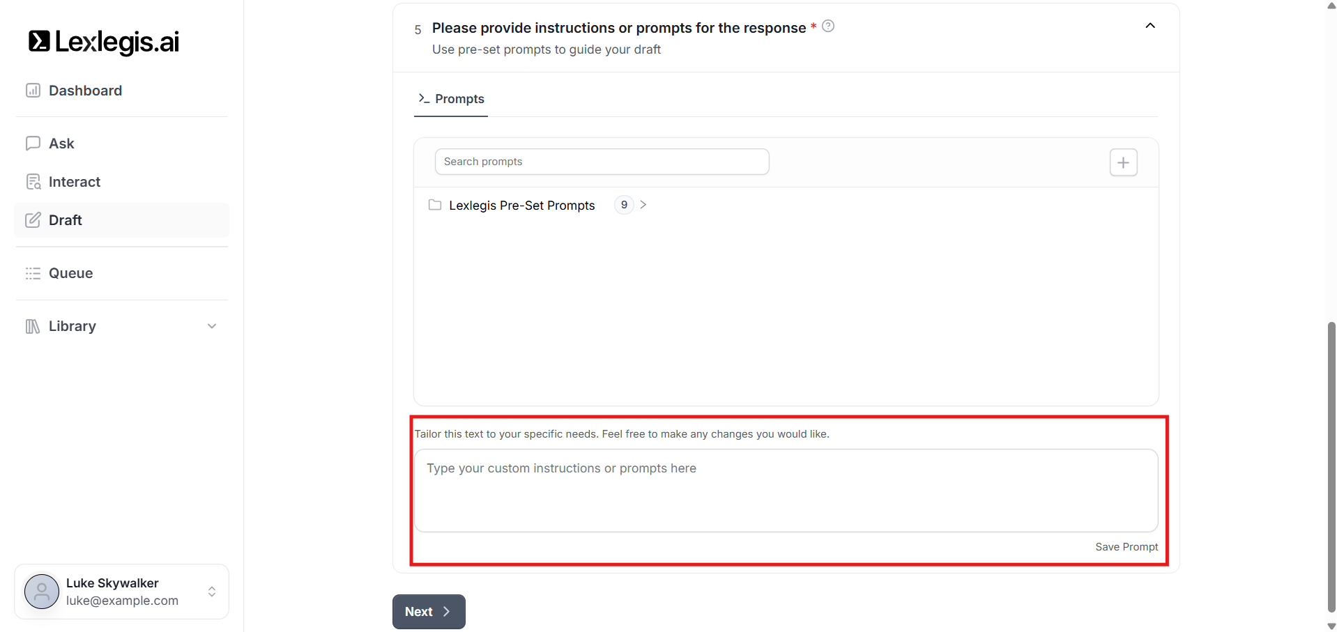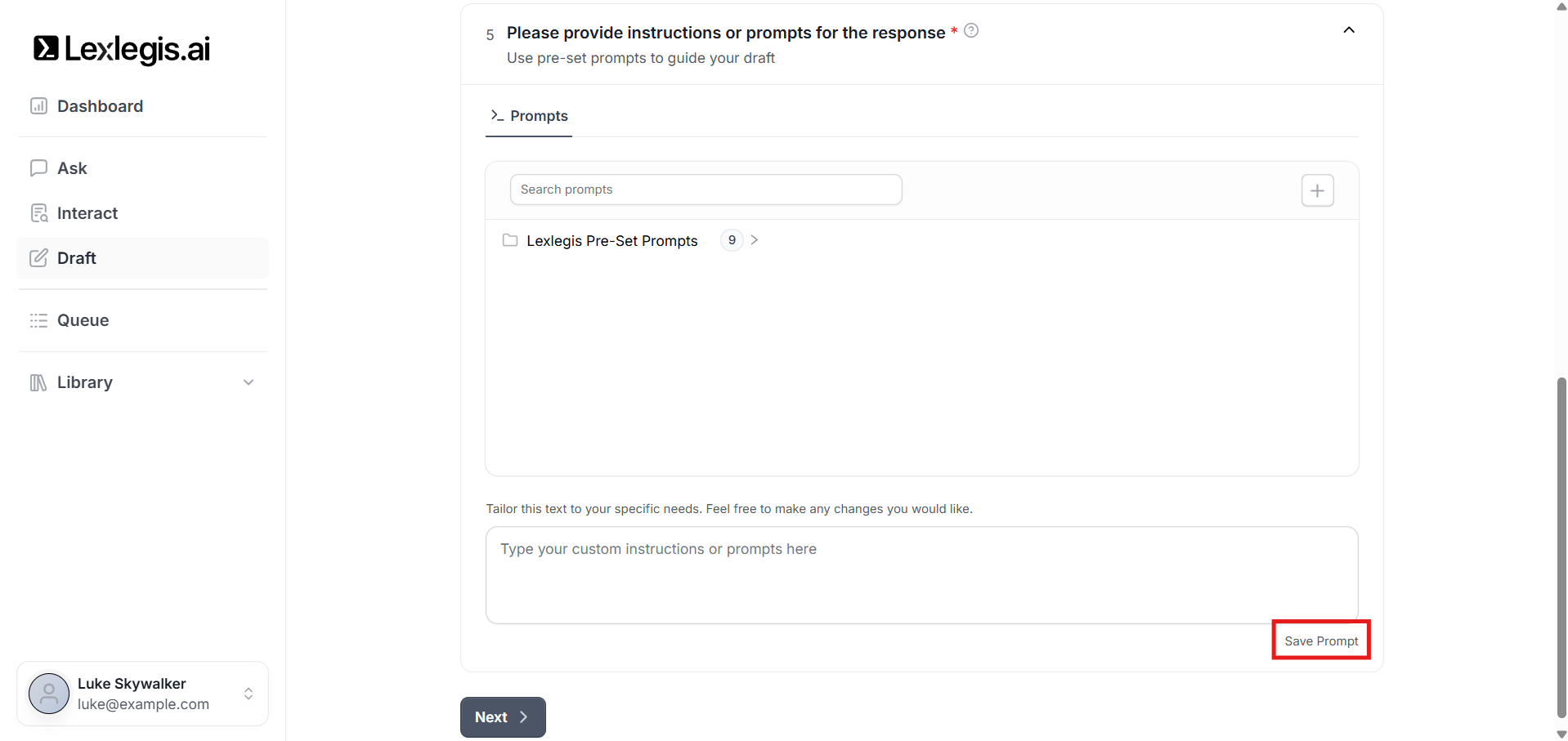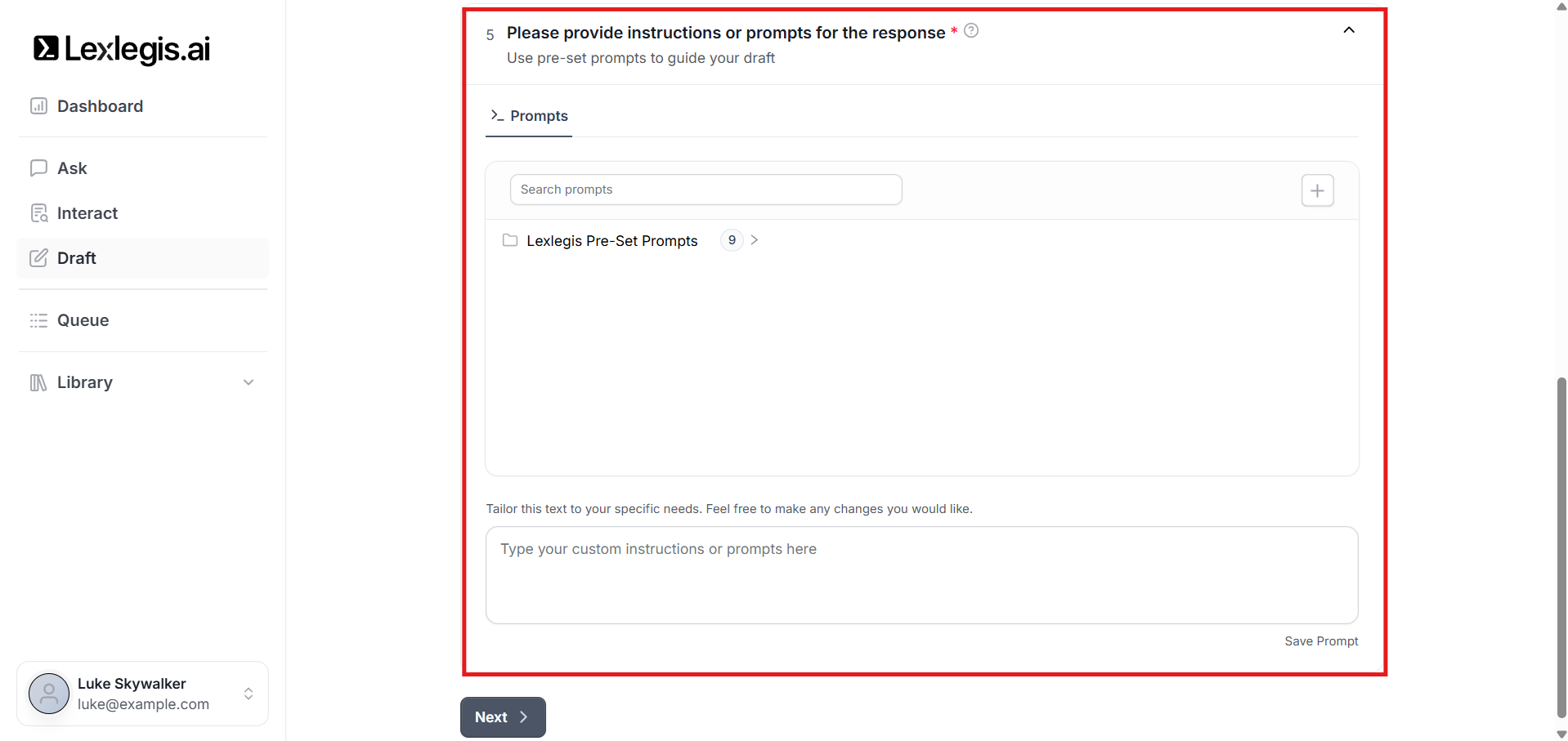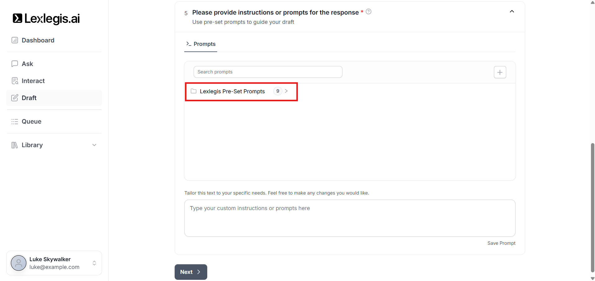 You can select from predefined prompts created by Lexlegis.