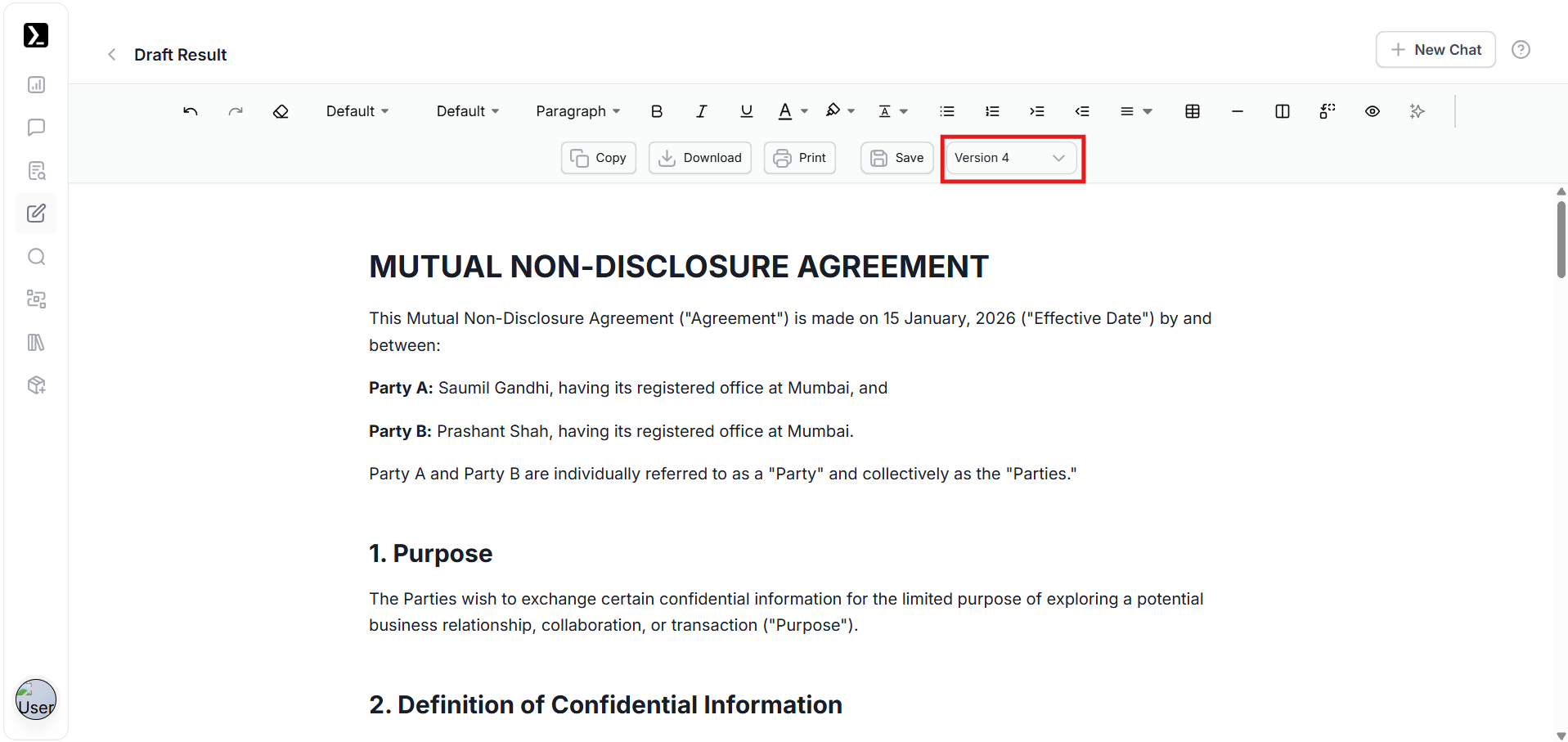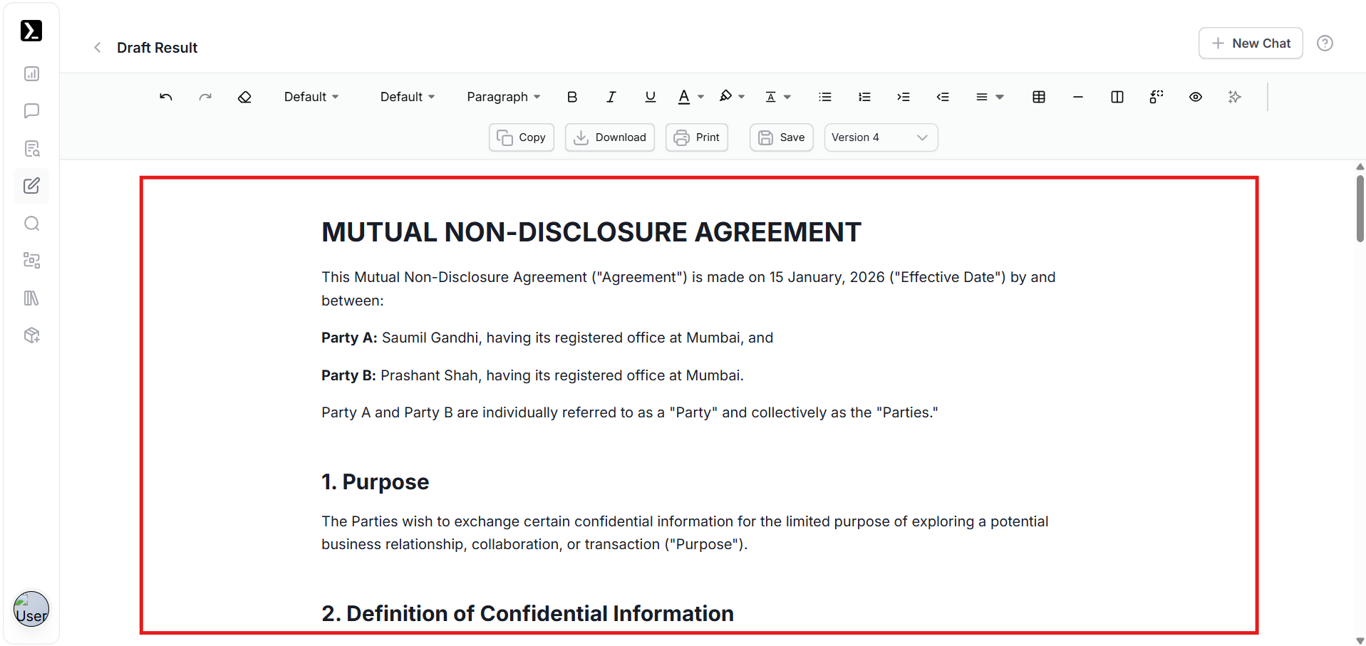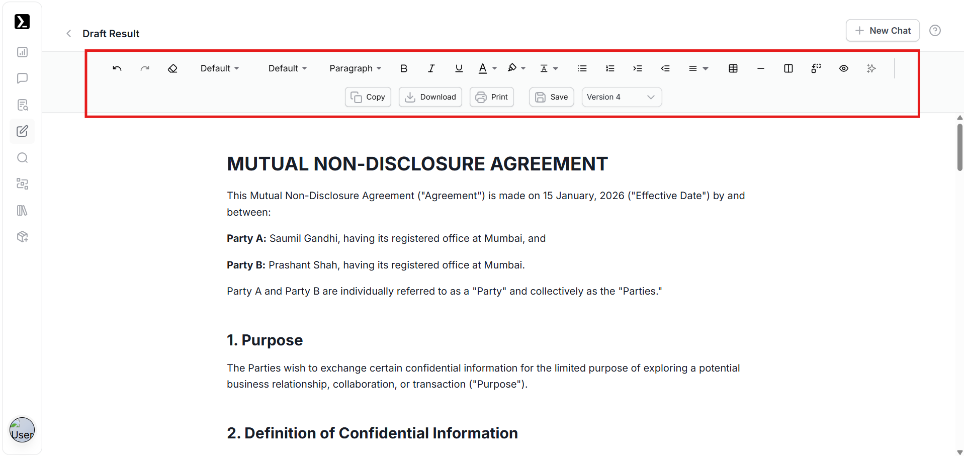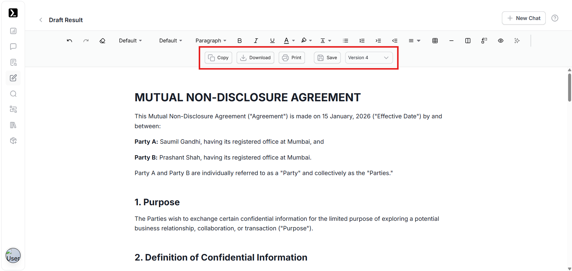 The Draft Result Page is designed to give you direct control over the content, while supporting iteration, formatting, versioning, and export.