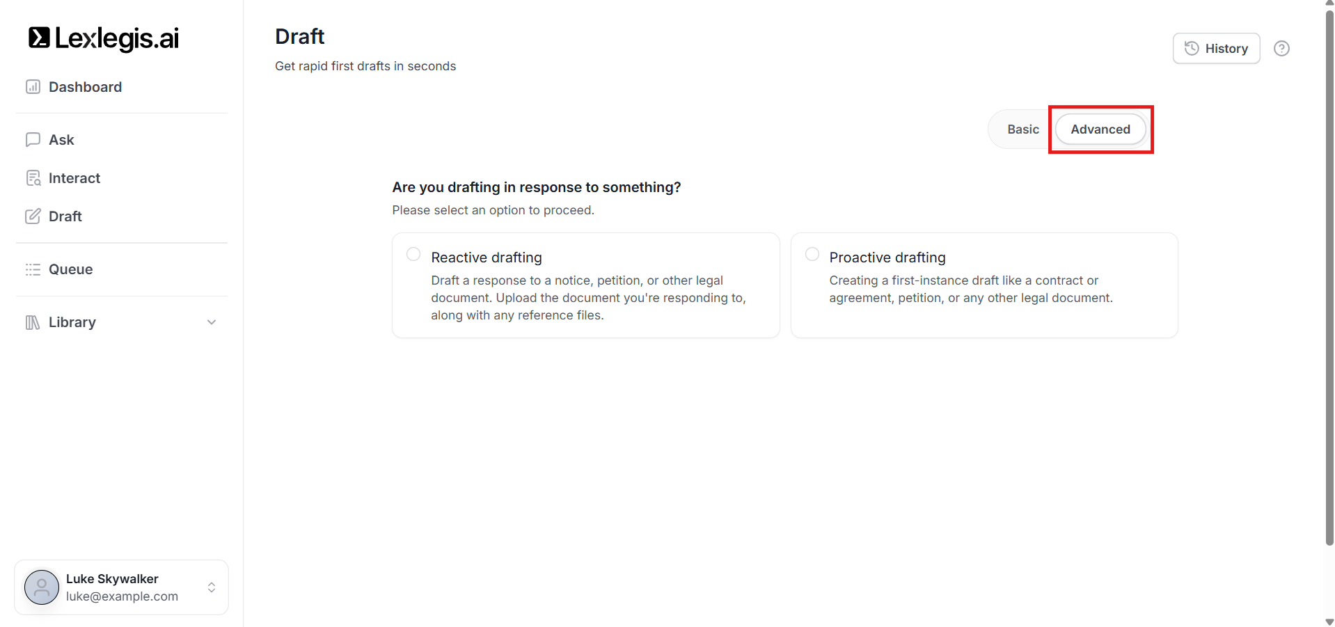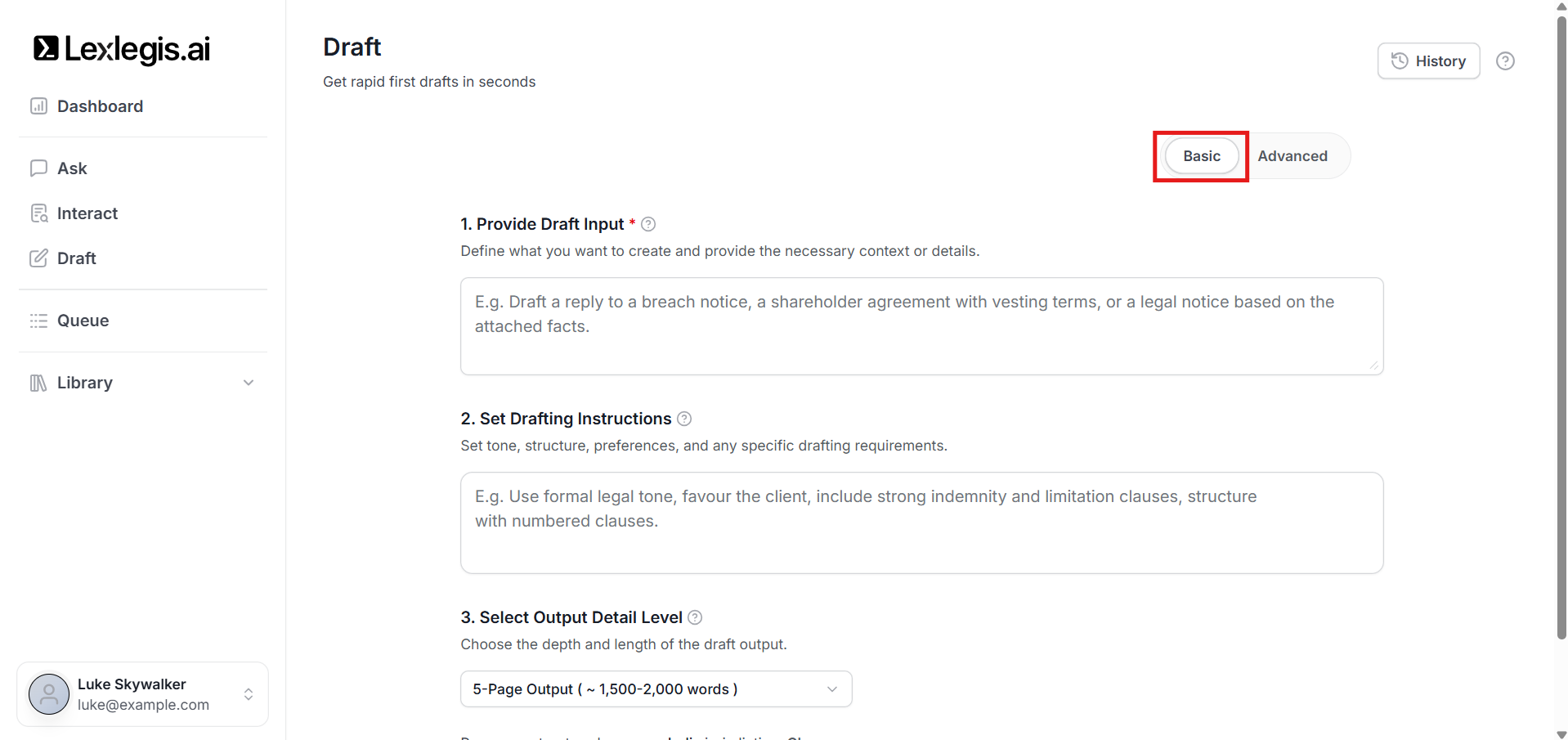 Draft is designed to make legal document creation both fast and flexible. Depending on your requirement, you can choose between Basic and Advanced modes.
